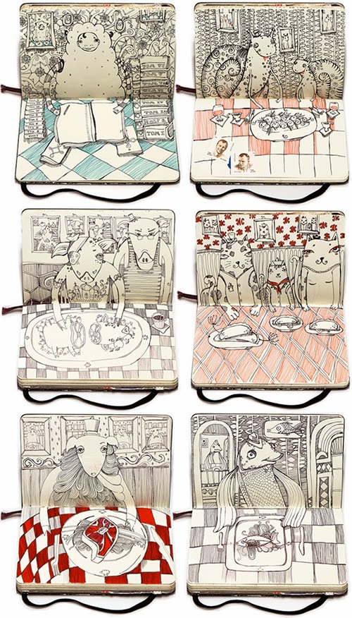 Love, love love(!) these sketches by Moscow-based artist Nataliya Platonova. A simple turn of the notebook makes all the difference as each little dinner comes to life on the page. See all the work here.